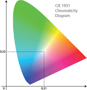 Der von der CIE (Internationale Beleuchtungskommission) festgelegte Farbraum in Form eines Hufeisens wurde ursprünglich im Jahr 1931 festgelegt. Er ist der Farbwahrnehmung des menschlichen Auges nachempfunden und ist als Referenzfarbsystem anerkannt. Er gilt für monochromatisches Licht mit Wellenlängen zwischen 380 nm und 700 nm.
